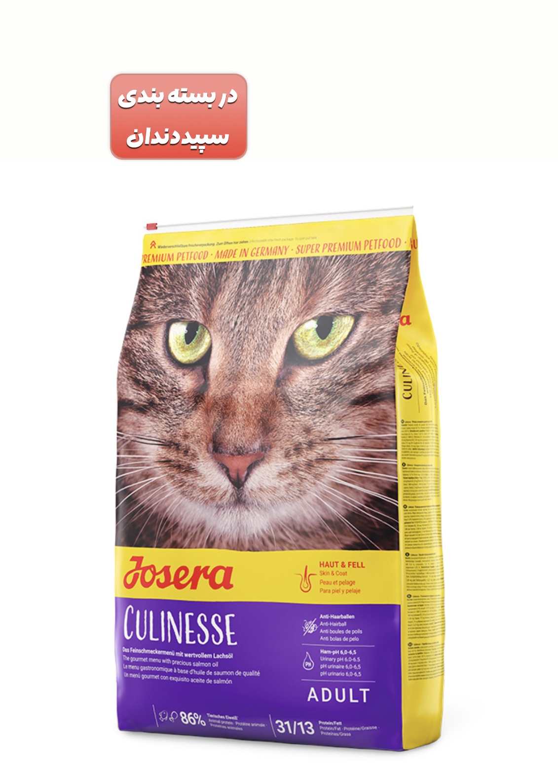 مخصوص گربههای بالغ حاوی گوشت پرندگان و ماهی سالمون دارای مواد اولیه بسیار خوش طعم با قابلیت هضم بالا حاوی مقادیر مناسب چربی برای گربههای داخل و خارج منزل حاوی اسیدهای چرب امگا 3 و امگا۶ و مولتی ویتامین جهت سلامت و درخشنگی موها دارای PH اسیدی جهت جلوگیری از تشکیل سنگهای ادراری بدون رنگهای مصنوعی، طعم دهندهها و مواد نگهدارنده
