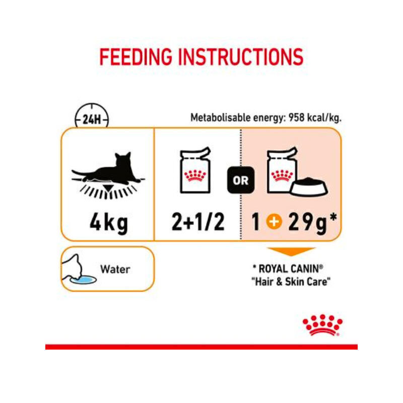 مناسب برای گربههای بالغ 1 تا 7 سال حاوی امگا 3 و 6 مناسب برای حفظ سلامت پوست و مو ترکیب منحصر به فرد ویتامینهای B، اسیدهای آمینه، روی و مس جهت تقویت و ساخت کراتین حاوی ترکیبات ویژه برای از بین بردن شوره، کدری و کمرنگی موها، سوزش پوست، ریزش مو و سایر مشکلات پوست و موی گربه حاوی روغن ماهی سرشار از امگا 3 و ویتامین D جهت سلامت، زیبایی و درخشندگی پوست و مو کمک کننده به حفظ وزن ایده آل در سس گوشت کمک به حفظ سلامت سیستم ادراری پروتئین با قابلیت هضم آسان و ظرفیت بیولوژیکی بالا