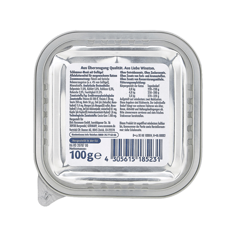 مناسب برای گربه های بالغ همهی نژادها تهیه شده از گوشت شکار تازه خوش طعم و لذیذ حاوی تائورین برای حفظ سلامت سیستم قلبی و عروقی و بینایی دارای انواع ویتامین ها و مواد معدنی ضروری گربه ها بدون غلات و مواد افزودنی و شکر مناسب برای دو وعده غذایی در دمای اتاق سرو شود پروتئین 11%، چربی 5%، فیبر 3%، خاکستر 2%، رطوبت 81%